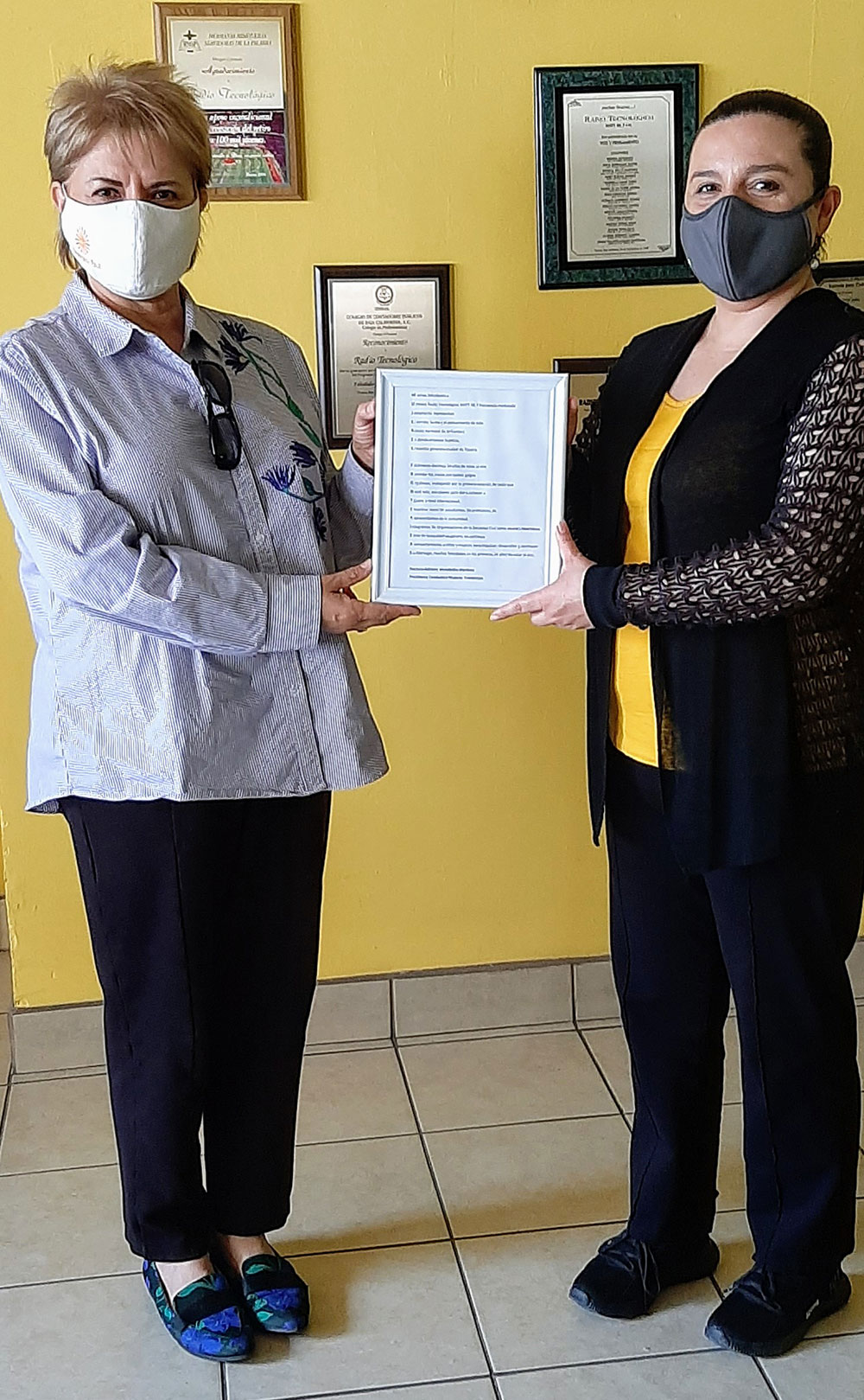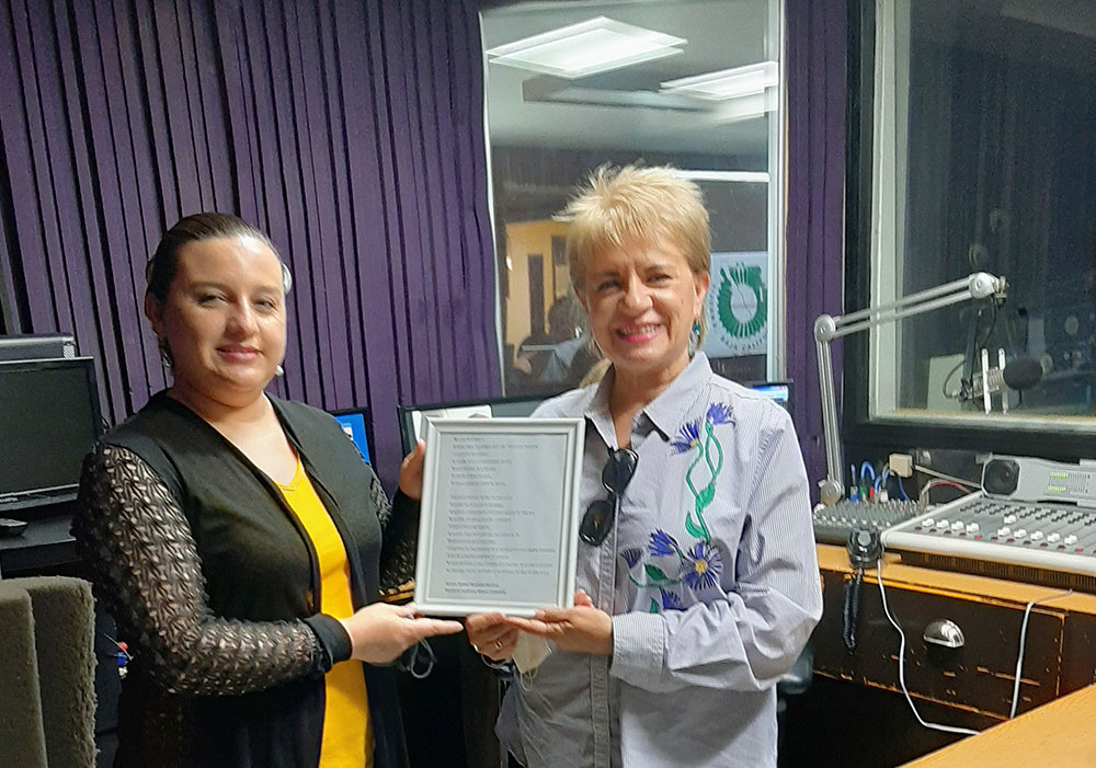 La Doctora Adriana Mendioléa entregando el Acróstico de Mujeres Fronterizas a la Lic. Alejandra Gutiérrez en el 34 aniversario de XHITT radio Tecnológico 88.7fm